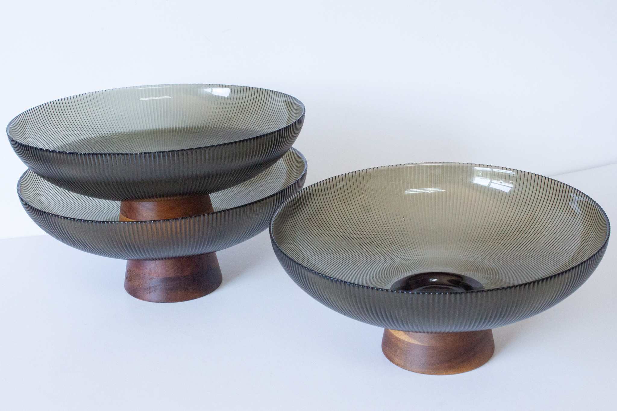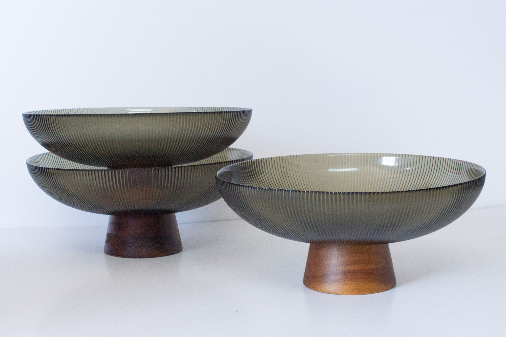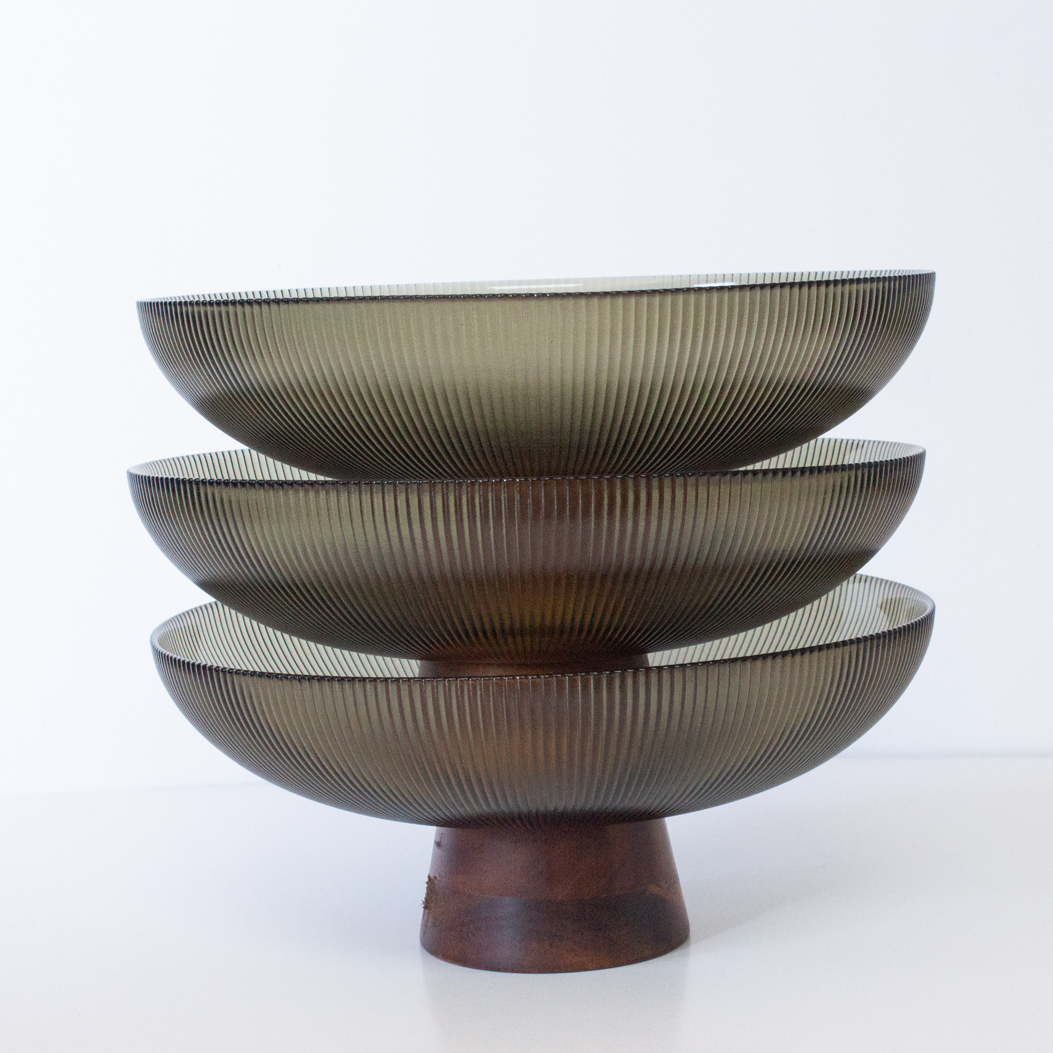 Add a touch of vintage-inspired elegance to your living space with our Ribbed Olive Glass Bowl with Wooden Base. This exquisite piece features a translucent, olive-tinted glass basin defined by delicate vertical ribbing that catches and diffuses light beautifully. The glass sits atop a tapered, solid wooden base, creating a perfect balance between industrial glasswork and warm, organic wood.